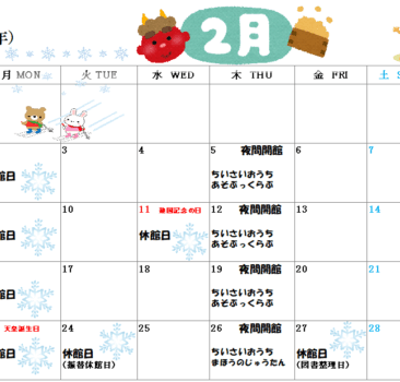 2月の休館日のお知らせです。 2月24日(火)は、月曜日が祝日のため、振替休館日です。 2月27日(金)は、図書整理日の...
