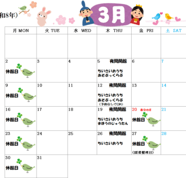 3月の休館日のお知らせです。 3月20日(金)は、祝日のため休館日です。 3月27日(金)は、図書整理日のため休館となり...