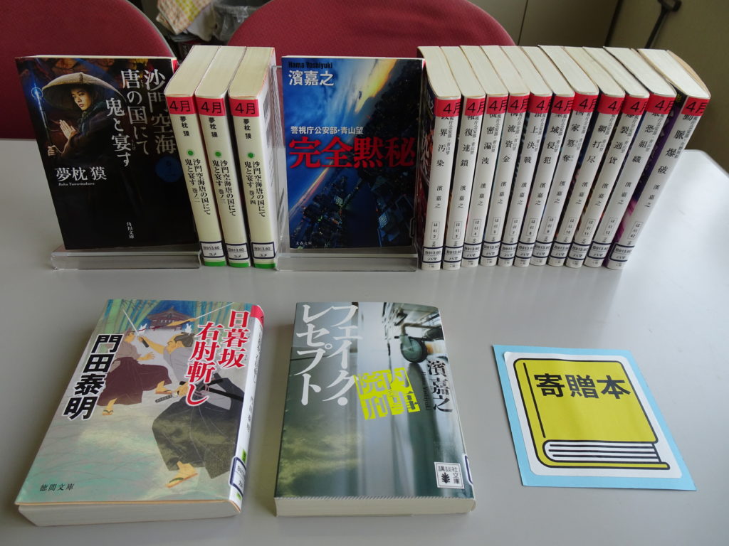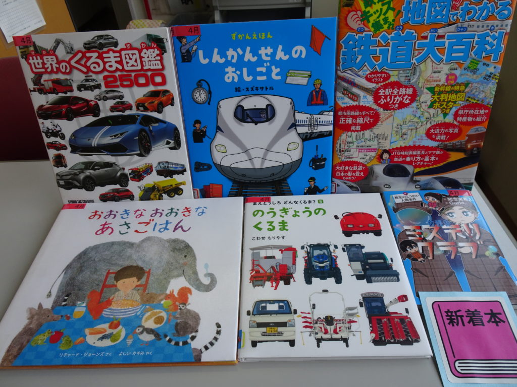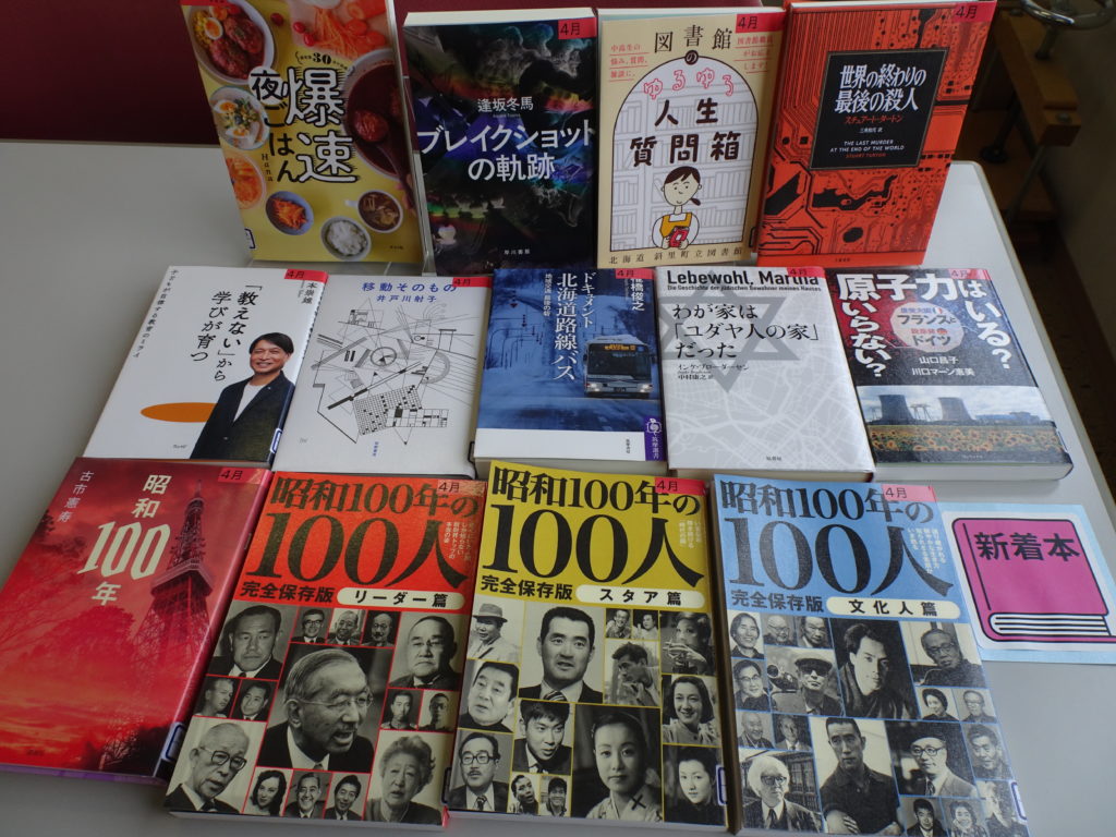 asobook 新着本 2025年4月6日 2025年4月6日 本日は、新着本と寄贈本の準備ができました。 新着本の『昭和100年の100人』2025年は昭和100年。文化人、リーダー、スターの3冊の中から、あれこれ振り返ってみるのはいかがでしょうか。 他には児童書にも一般向けにも鉄道の本があったり、お母さんのための爆速ごはんの本などなど。 寄贈本は、蔵書している文庫本も古くなってきているので少しずつ新しいものへ、ということで、24冊、入りました。濱嘉之さんの警視庁公安部シリーズに時代小説やホラー短編集など、盛りだくさんですので、ぜひご覧ください。