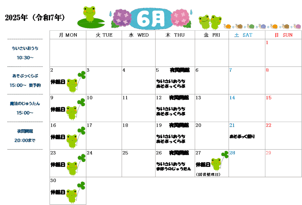 asobook お知らせ 2025年5月31日 2025年5月31日 6月の休館日のお知らせです。 6月27日(金)は、図書整理日のため休館となります。 6月21日(土)は、あそぶっく祭りですが、図書館は通常開館となります。 あそぶっく祭りは、町民センターで9時半から12時半まで行います。 ぜひ、お越しください。
