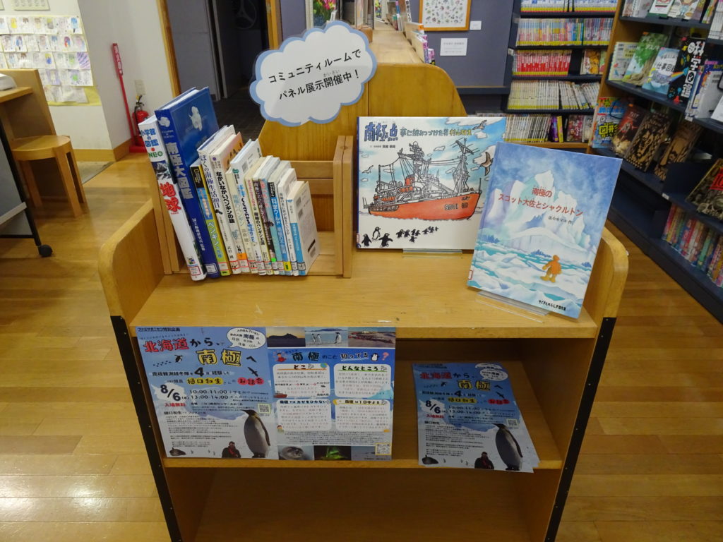 コミュニティルームでのパネル展示と、南極に関する本の展示を行っております。