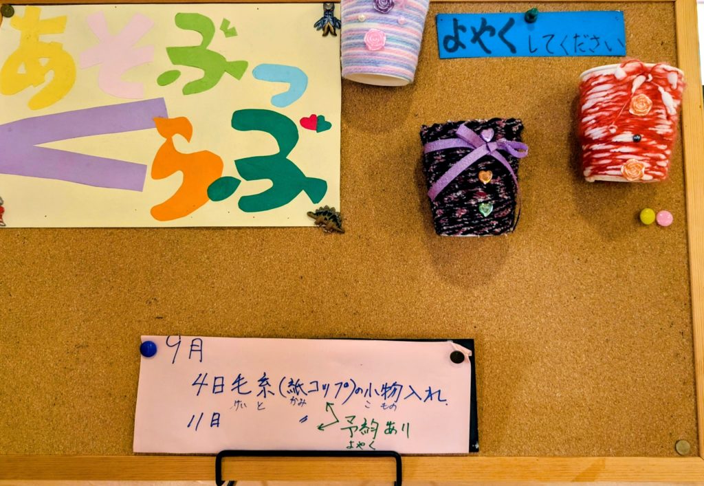 来週9月4日(木)はあそぶっくらぶ『毛糸(紙コップ)の小物入れ』です。